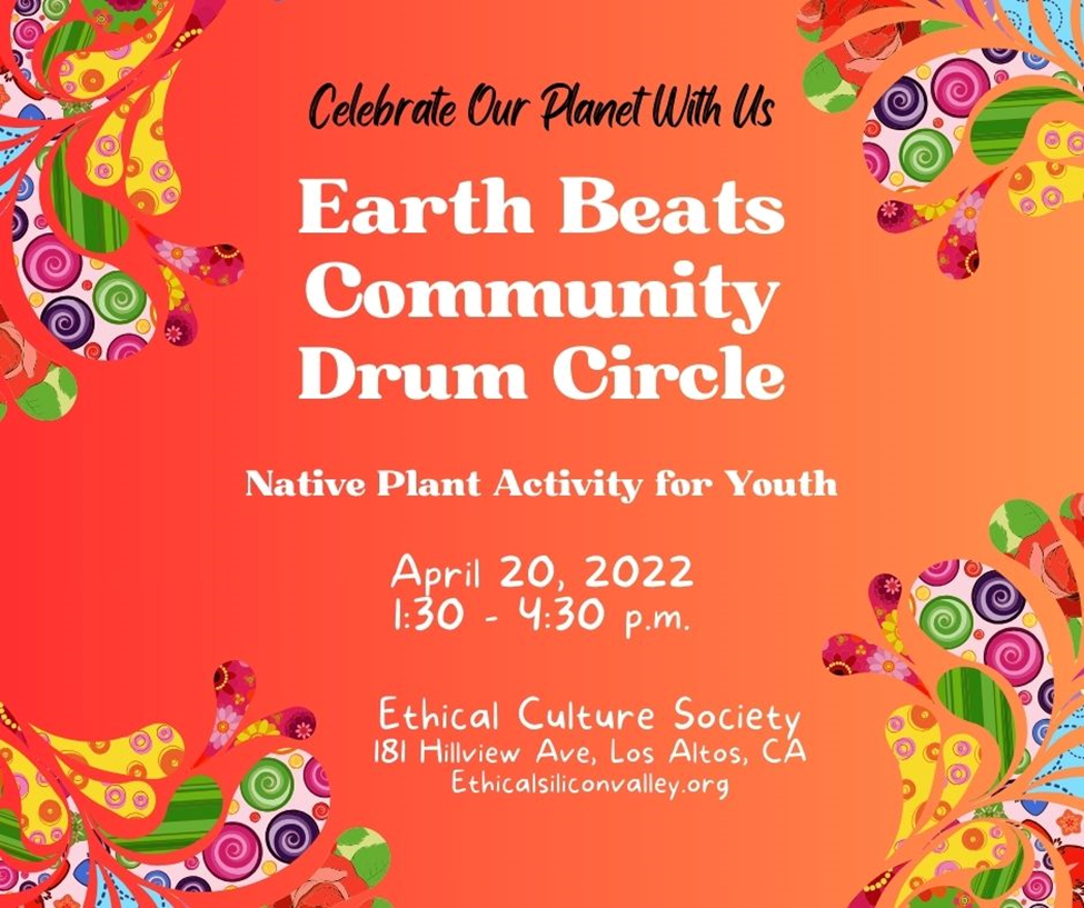 Earth Beats Community Drum Circle: Join the Ethical Culture Society of Silicon Valley in celebrating Earth Week! Pick up a drum and learn some basic earth rhythms as we come together to create a biosphere of sound. Take a break, enjoy a refreshment, and participate in a workshop to build your own recycled peat pot, helping to spread native plants throughout the valley. All activities are free, kid-friendly, and open to the public. April 20th from 1:30 to 4:30 p.m. at the Neutra House Conference Center, located at 181 Hillview Ave, Los Altos, CA 94022.